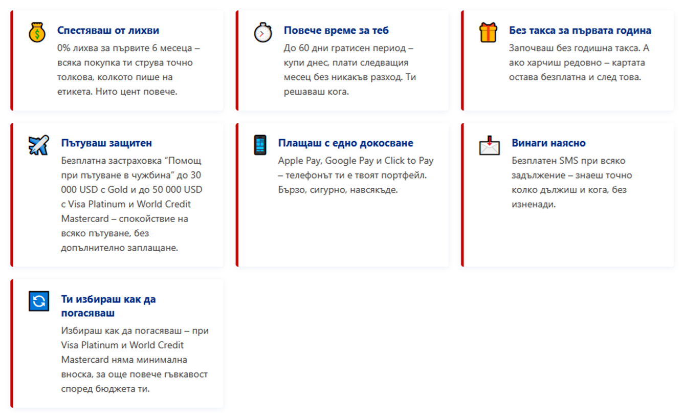 Нашите кредитни карти са не просто средство за разплащане. Те са твоят спътник в динамичното ежедневие, твоят резервен план в непредвидени моменти и твоят ключ към повече комфорт, стил и спокойствие.