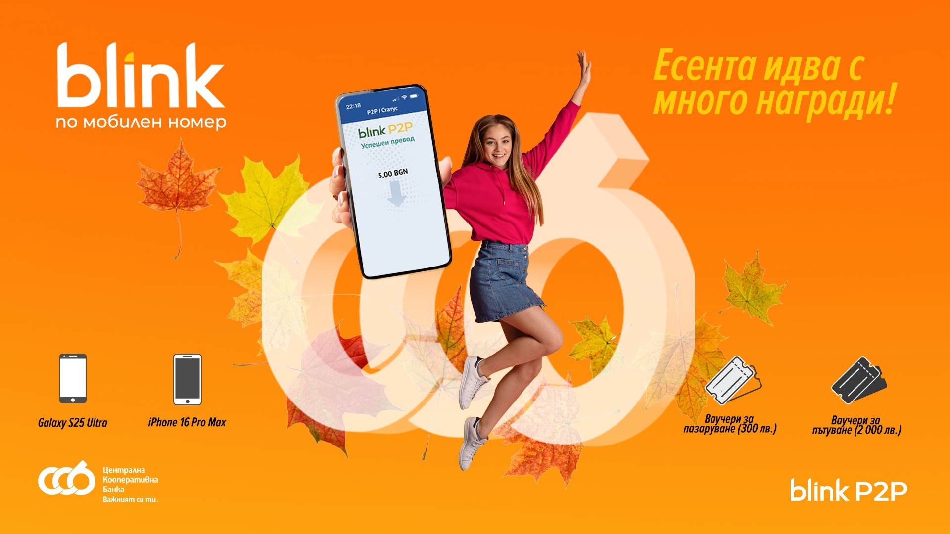 От 16 октомври до 15 декември 2025 г. имате възможност да участвате за страхотни награди, когато изпращате преводи с blink P2P по мобилен номер през CCB Mobile.
